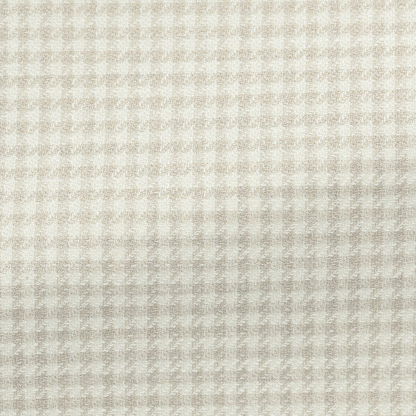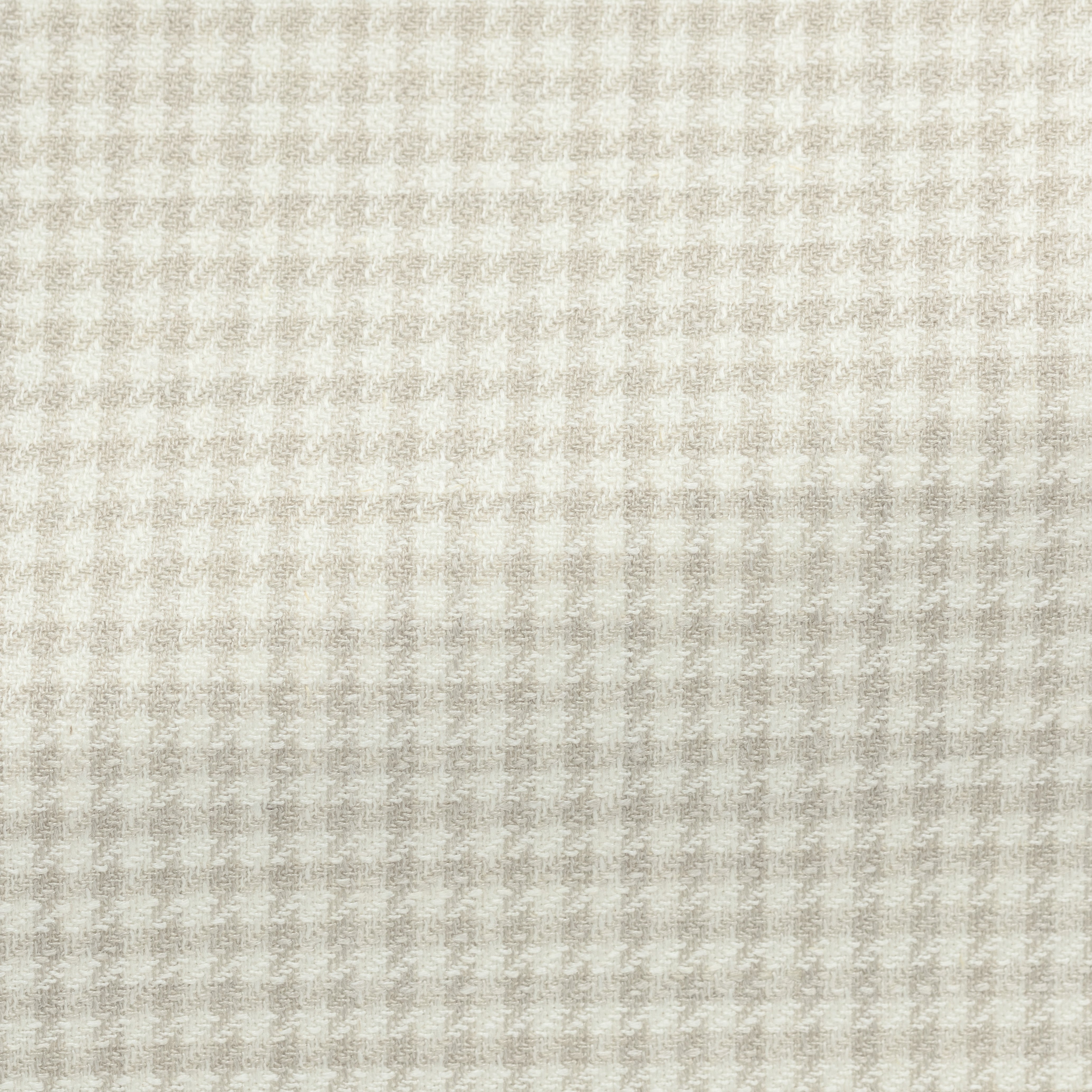 Stoffet har en vægt på 255 g/m, som giver et smukt, naturligt fald uden at føles tungt. Den klassiske houndstooth i lyse ivory/ecru toner skaber et raffineret, moderne udtryk, mens silken tilfører et subtilt skær og ekstra blødhed.
