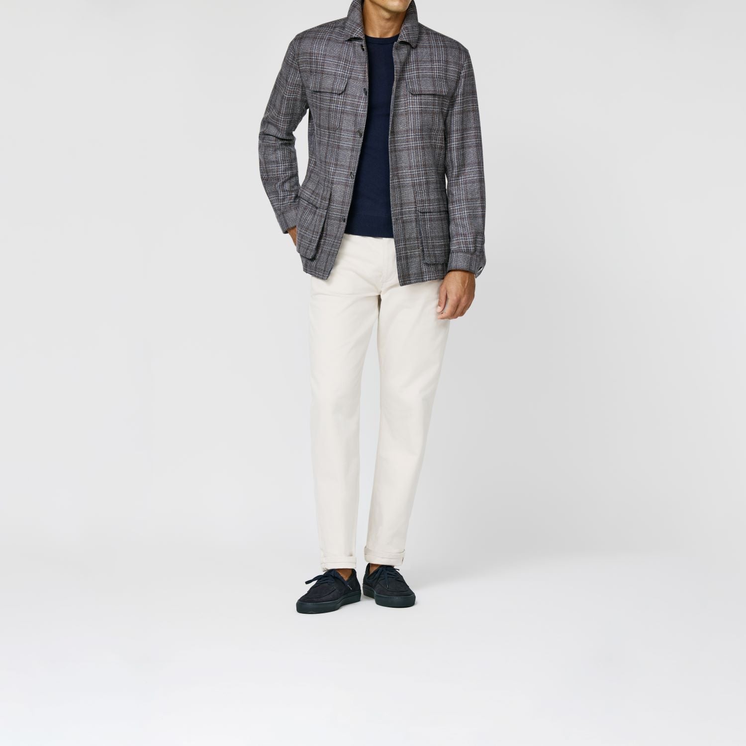 Denne eksklusive metervare fra ikoniske Loro Piana forener italiensk håndværk, raffineret æstetik og en exceptionel komfort. Stoffet er vævet i en elegant oatmeal mélange-tone med et diskret kobber glencheck, der giver dybde, karakter og tidløs elegance.