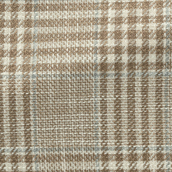 Denne enestående metervare fra Loro Piana forener klassisk sartorial elegance med moderne lethed. Den varme tan-ivory bundtone danner et blødt, solkysset lærred, hvor det raffinerede glencheck mønster spiller i fin harmoni med et markant storm grey windowpane. Resultatet er et stof, der føles både tidløst og samtidig overraskende nutidigt.